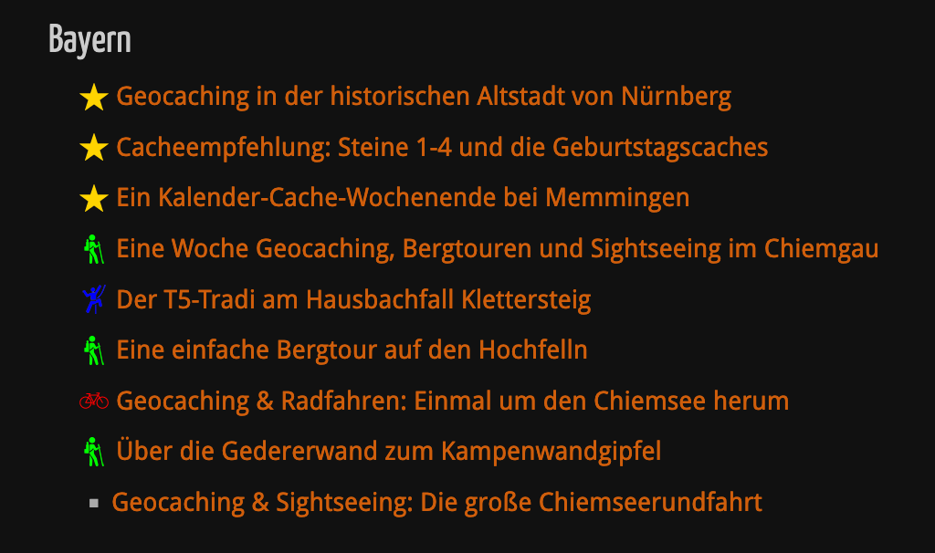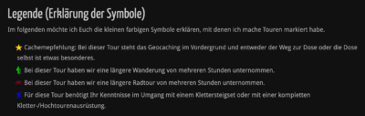 Mittlerweile habe ich schon unzählige Reiseberichte über unsere Touren geschrieben und nicht immer geht aus dem Titel klar hervor, was der Charakter dieser Tour ist. Daher habe ich mir überlegt, dass es doch recht hilfreich sein könnte, wenn Euch bei „besonderen Touren“ ein kleines Symbol darüber informiert, um was es genau geht. Daher habe ich die folgenden fünf Symbole für Cacheempfehlungen, Wanderungen, Radtouren und Kletter- oder Hochtouren eingeführt: