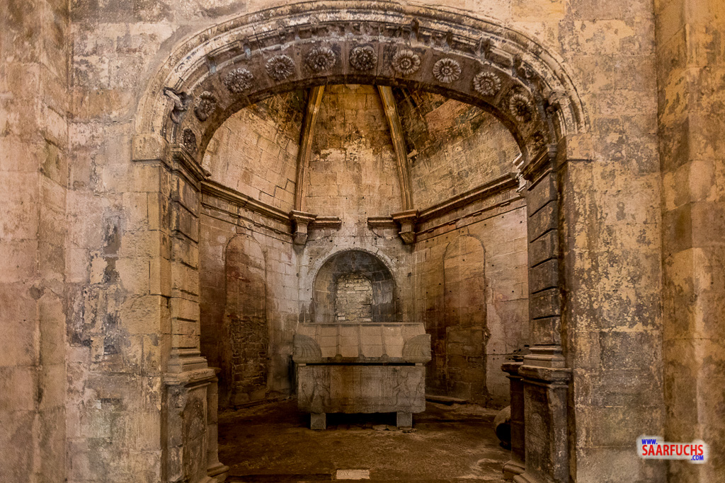 Nur im hinteren Teil ist die Kirche abgeschlossen und hat ein Dach. Wir gehen hinein. Drinnen fällt mir diese Nische auf, in der ein Sarkophag steht.