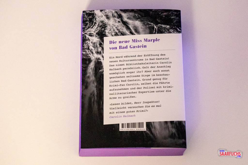 Im Krimi lernen wir die Bibliothekarin Carolin Halbach aus Düsseldorf kennen, die es beruflich nach Bad Gastein verschlagen hat, wo sie die Leitung der neu eröffneten Bibliothek im Kulturzentrum übernimmt. Auf der Eröffnungsveranstaltung für das Kulturzentrum ereignet sich ein Todesfall, der sich später als nicht natürlich herausstellt: Eisenhut im Tonic Water, das das Opfer getrunken hat, war die Ursache für dessen Tod. Das Tonic Water hat dann mit „Bitterwasser“ den naheliegenden Titel für den Krimi geliefert und die Farbe des Eisenhutes die für die Schnittverzierung der Buchseiten. Das fand ich bereits sehr ansprechend und gut gemacht, aber auch der Krimi hat mich überzeugt: Karin Uhlig kann nicht nur Lokalkrimis aus der Provence, sondern eben auch solche aus Österreich! So wird die Bibliothekarin mit Universitätsabschluss in Österreich ganz selbstverständlich zur Frau Magister und auch der Dialekt überzeugt und brachte mich immer mal wieder für Schmunzeln. Zusätzlich sorgt die lebendige Beschreibung des Ortes Bad Gastein dafür, dass man Lust bekommt sich diesen besonderen Ort einmal ein paar Tage anschauen zu wollen: Bad Gastein liegt am Bad Gasteiner Wasserfall und die Gebäude des historischen Ortskerns wurden direkt am Hang gebaut, was beispielsweise dazu führt, dass Carolin, um zur Stadthalle zu kommen, in der sich die Bibliothek befindet, im Parkhaus am Wasserfall elf Stockwerke mit dem Aufzug nach unten fahren muss. Dieses Parkhaus gibt es tatsächlich, die Bibliothek leider nicht, allerdings ein Kongresszentrum, in dem Karin in ihrem Buch die Bibliothek angesiedelt hat. Ich mag es, wenn Aussagen aus Büchern Entsprechungen in der Realität haben und gucke mir diese dann gerne an.Wenn dann noch eine stimmige Story dazukommt, bin ich wunschlos glücklich. Und auch das gelingt Karina Ewald: Zunächst scheint es so zu sein als ob der Tod ein Unfall war, der von Gegnern des Kongresszentrums, die für die alte Stadthalle andere Pläne haben, im Rahmen mehrere Sabotageakte billigend in Kauf genommen wurde. Dann findet die örtliche Polizei in einer Mitarbeiterin der Bibliothek eine Tatverdächtige, die das Mittel und die Gelegenheit hatte, aber auch in Untersuchungshaft beharrlich schweigt, so dass das Motiv im Dunkeln bleibt. Das Schweigen scheint jedoch Beweis genug für ihre Schuld. Carolin Halbach ist allerdings nicht von der Theorie der örtlichen Polizei überzeugt und ermittelt auf eigene Faust. Dabei kommt sie dem wahrenTäter näher als diesem lieb sein kann und es kommt im Verlauf des Plots zu mehreren brenzligen Situationen für Carolin. Mit der Auflösung, die der Krimi liefert, hätte ich nicht gerechnet, möchte aber an dieser Stelle nicht mehr verraten. Nur zwei Dinge noch: Das Buch von Karina Ewald alias Karin Uhlig ist ein super Urlaubskrimi und macht Lust mehr von Carolin Halbach zu hören.
