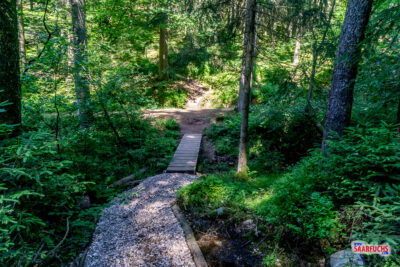 Über eine kleine Brücke wechseln wir die Seite. Um schlammige Wege zu vermeiden, wurde hier ein schöner Kiesweg angelegt.