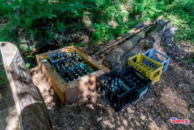 Aus dem Bach wird Wasser in eine Box abgeleitet und dort zur Kühlung von Getränken verwendet. Bei uns wird Bier, Saft und Wasser günstig angeboten – die Kosten werden in eine Vertrauenskasse eingeworfen. Wir nutzen diese Gelegenheit für eine gemütliche Trinkpause.