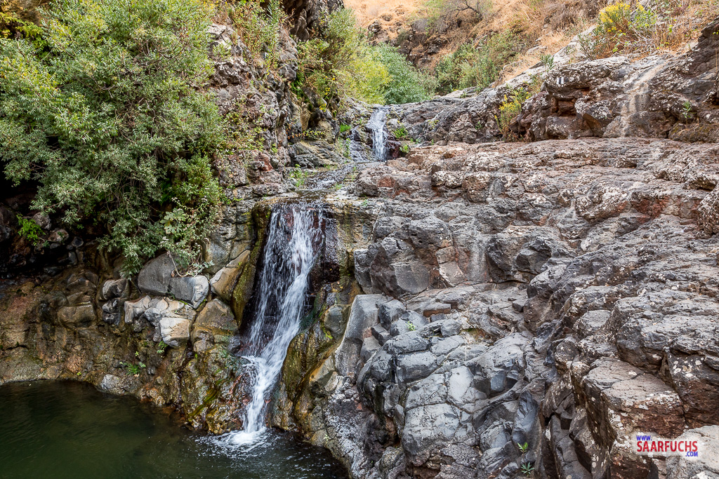 An der nächsten beschilderten Abzweigung folgen wir zunächst weiter dem Fluss bis zu einem kleinen Wasserfall, der von einer Quelle gespeist wird.