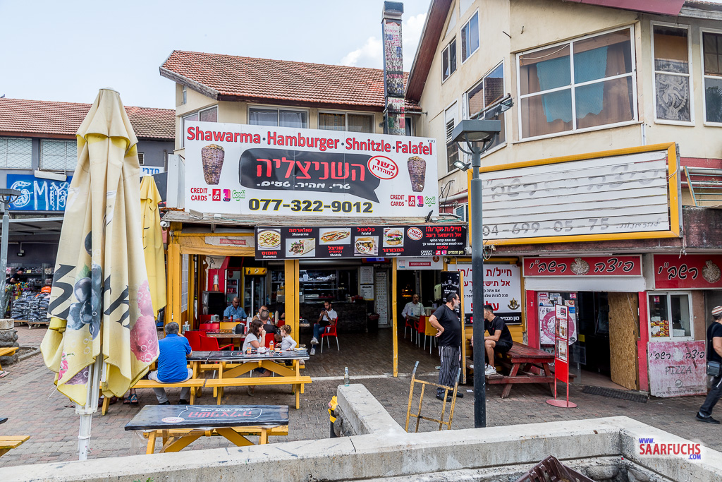 saarzwerg bestellt sich ein Fladenbrot mit Falafel und ich mit Hühnchen. Dazu nehmen wir noch ein Getränk und bezahlen alles mit der Kreditkarte, die in Israel fast überall zum Bezahlen verwendet werden kann.