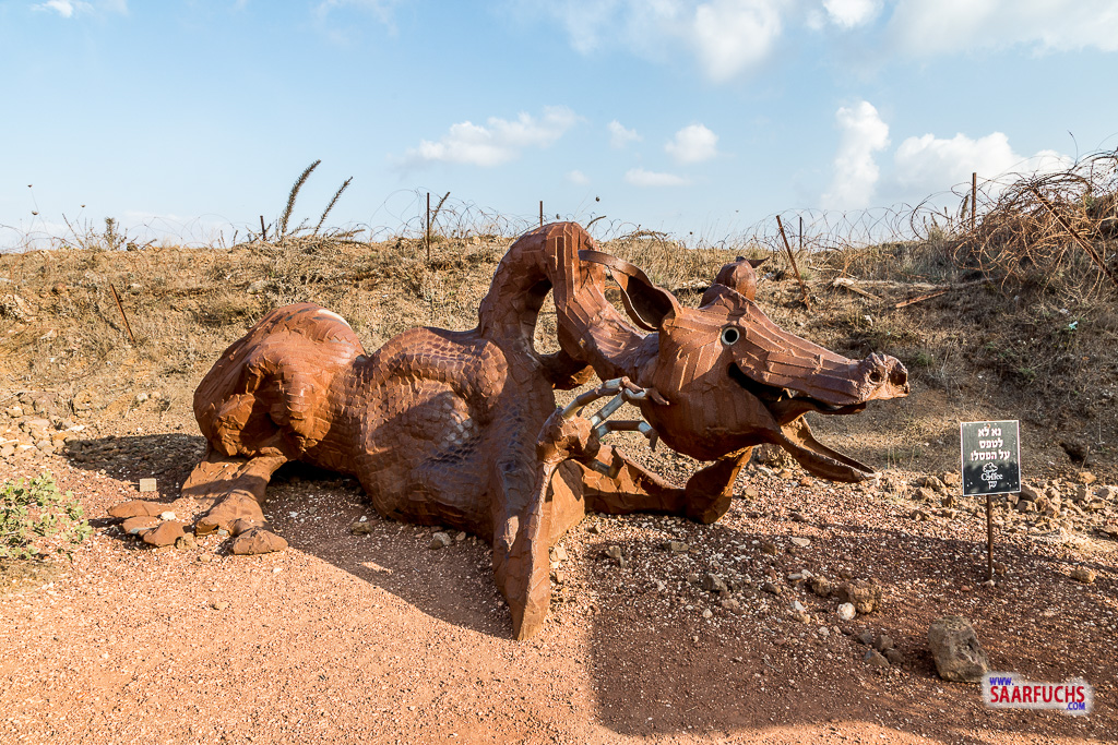 Wir blicken hier auf die UN-Pufferzone, die 1974 geschaffen wurde, um den Konflikt zwischen Syrien und Israel etwas zu „entschärfen“. Im Sechstagekrieg von 1967 hat Israel diese Region erobert und anschließend die ehemaligen Einwohner größtenteils vertrieben und danach die Golanhöhen besetzt. Auf unserem Spaziergang über das flache Gipfelplateau kommen wir an diesen aus Schrott geschaffenen Kunstwerken vorbei.
