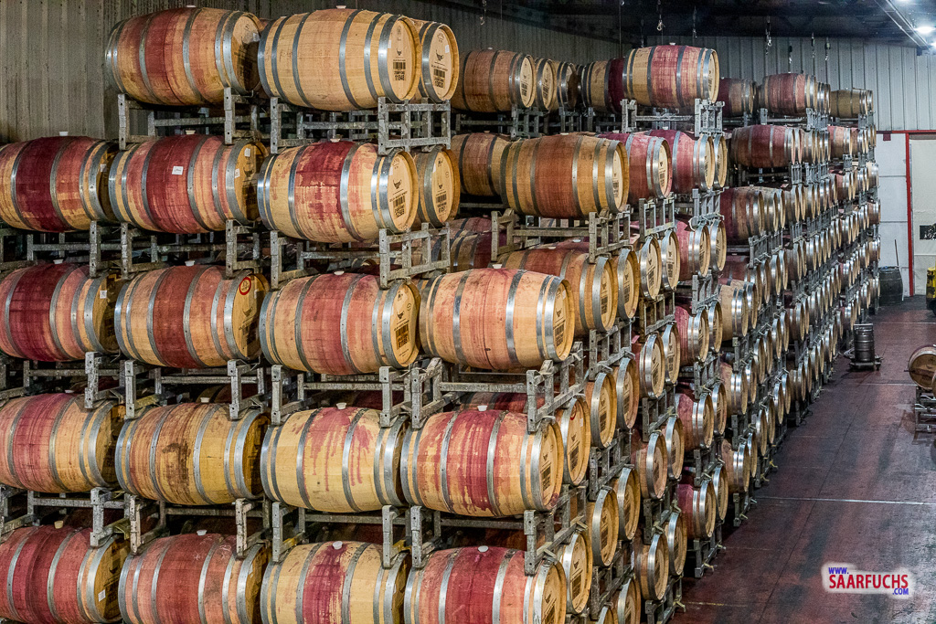Er führt uns zunächst durch die riesige Lagerhalle, wo unzählige Fässer bis zu Decke gestapelt werden.