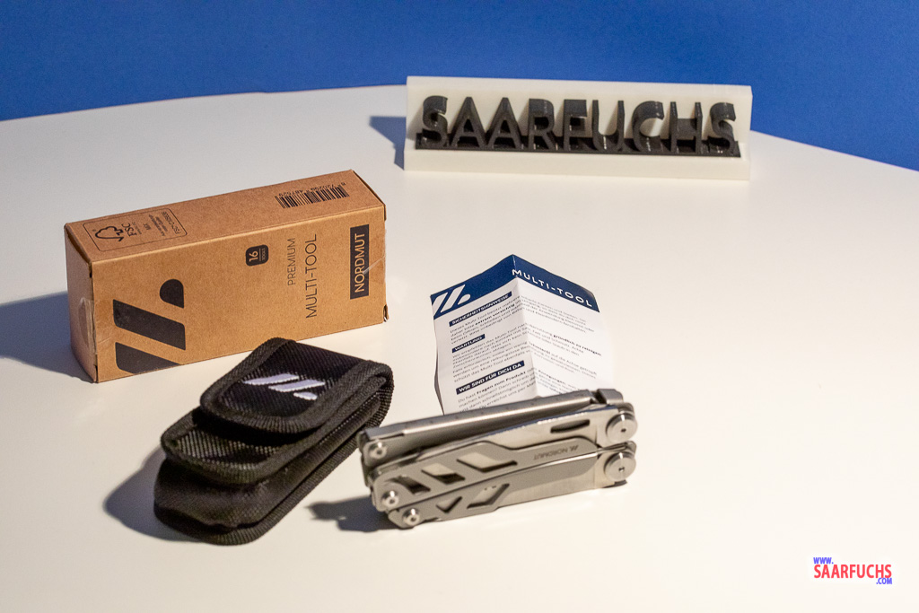 In der Schachtel befindet sich ein Holster aus robustem Nylon, das Nordmut Multi-Tool und ein kleiner Beipackzettel mit einer Kurzanleitung und Sicherheitshinweisen in deutscher Sprache.