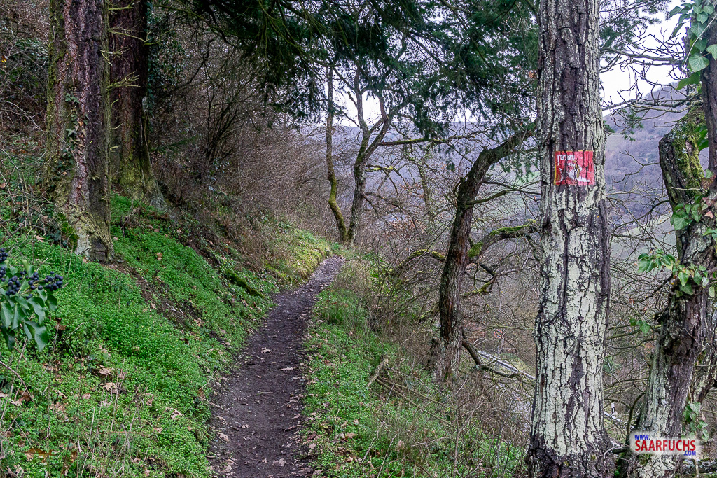 Kurz danach biegen wir aber wieder in den steilen Hang ab, steigen eine Treppe herunter und folgen wieder einem schmalen Pfad.