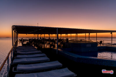 Während der Kreuzfahrt genießen wir die Vollpension auf dem Schiff, die gleich nach dem Einchecken mit einem Mittagessen in Buffetform beginnt. Leider gibt es für den Rest des Tages kein Programm. Da die MS Prince Abbas an einer recht hässlichen Stelle im Hafen liegt, haben wir auch nicht wirklich die Möglichkeit das Schiff zu verlassen. Wir beschäftigen uns daher auf dem Sonnendeck mit Lesen von Reiseführern und dem Beantworten von den Earthcaches der letzten Tage.