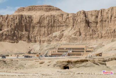 Gegen halb zwölf Uhr mittags erreichen wir den Busparkplatz am Totentempel der Hatschepsut. Nachdem unser Guide die Tickets gekauft hat, warten wir auf die kleinen Elektrobusse, die uns vom Besucherzentrum zum Tempel bringen. Ich nutze die Zeit, um ein Foto vom Totentempel zu machen, der hier unter einer riesigen Felspyramide gebaut wurde.