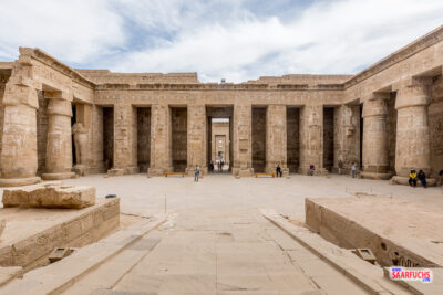 Nachdem wir das Tor passiert haben, blicken wir auf den ersten Pylon mit dem Eingangsportal des Tempels, den Ramses III. im 12. Jahrhundert v. Chr. erbauen ließ.