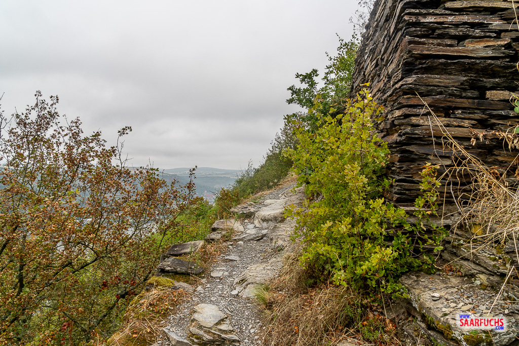 Hinter dem Sportplatz von Heide beginnt der Abstieg hinunter nach St. Goarshausen. Dabei kommen wir an zwei Aussichtspunkten vorbei, die eine schöne Sicht auf die Burg Katz ermöglichen.