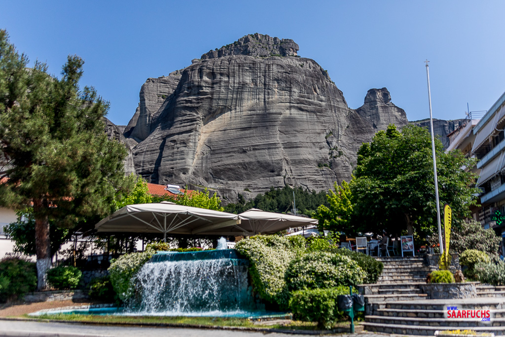 Für die 23 Kilometer von Trikala bis zu den Meteora-Felsen benötigen wir mit unserem Reisebus eine dreiviertel Stunde. Schon vor der Ortseinfahrt von Kalambaka sind die mächtigen Felsen aus der Ferne gut zu erkennen.