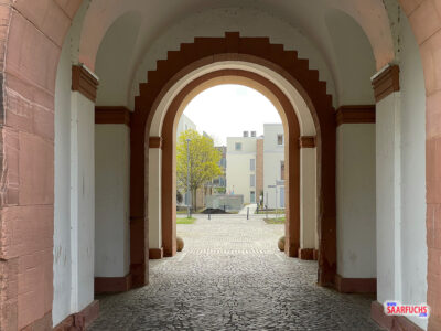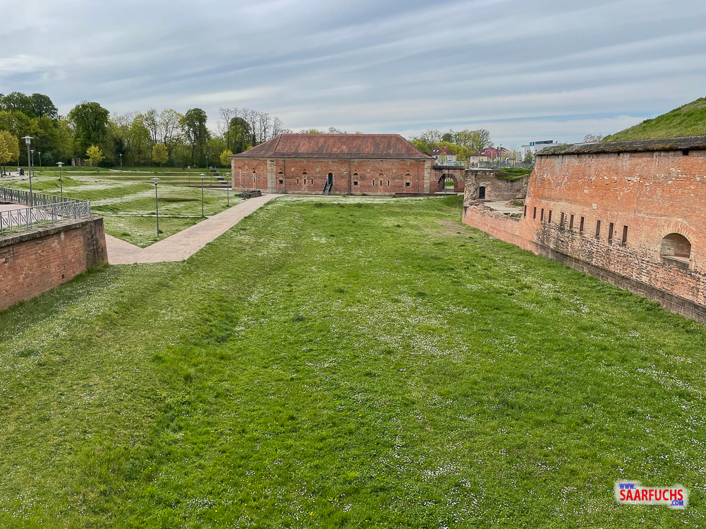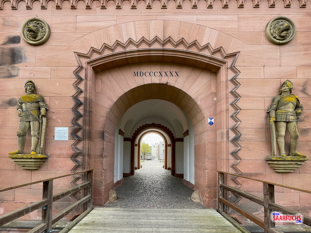 Vom Parkplatz des Einkaufszentrums aus überqueren wir die Straße und laufen durch den Park zum Weißenburger Tor. Das Tor wurde im Jahr 1839 erbaut und ist eines der beiden ehemaligen Stadttore der Germersheimer Festung. Heute beherbergt das Tor das Tourismus-, Kultur- und Besucherzentrum der Stadt Germersheim. Mit der davor liegenden Brücke sieht das Tor recht kolossal aus. Auf der Brücke beantworten wir die vorletzte Frage unseres LabAdventures.