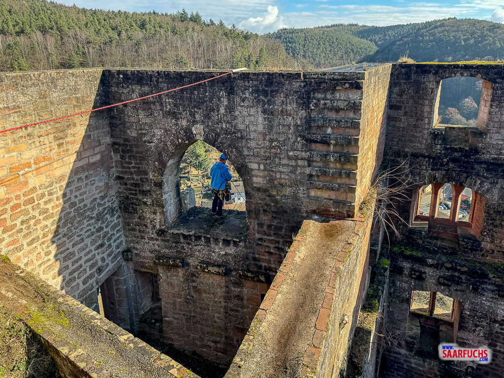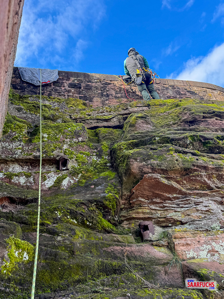Nach Rücksprache bekommen wir einen Anschlagspunkt für unsere Seile überlassen. Wir bauen auf und steigen gesichert über die Mauer. saarzwerg schaut mir von oben zu.