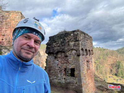 Auch uns macht es immer wieder Spaß, an diesem Event teilzunehmen, obwohl wir nicht klettern können. Wir sammeln stattdessen Müll ein, bewachen quergespannte Kletterseile, entfernen Gebüsch im Hang um die Burg herum oder helfen aufzupassen, dass niemand etwas auf den Kopf bekommt, was weiter oben von den Mauern entfernt wird. Zwischendurch freuen wir uns über die netten Gespräche mit anderen Cachern. Wir kommen im Herbst gerne wieder