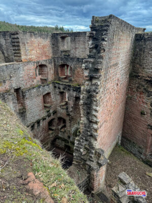 Am ehemaligen Hauptgebäude der Burg machen wir eine kurze Pause und schauen nach oben. Dort befindet sich ein toller Erker, der im Mittelalter zur Kapelle der Burg gehört hat.