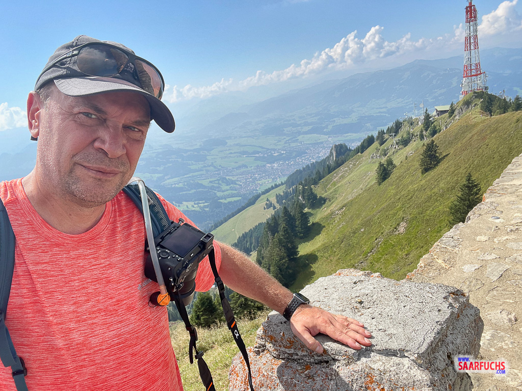 Danach schaue ich mich etwas hier oben um. Der Grünten wird oft als „Wächter des Allgäus“ bezeichnet, weil er eine markante Lage direkt am Alpenrand hat. Er ist der erste Allgäuer Alpengipfel, der in den Blick fällt, wenn man aus dem Norden kommt. Mit einer Höhe von 1.738 Metern bietet der Grünten einen traumhaften 360-Grad-Panoramablick über den gesamten Landkreis Oberallgäu und die Allgäuer Alpen. Und die Aussicht von hier oben ist einfach atemberaubend.