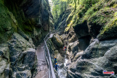 Nach zwölf Minuten haben wir die nächsten 90 Höhenmeter Abstieg hinter uns gebracht und erreichen die Starzlach, die sich hier tief zwischen den Felsen eingeschnitten hat. Wir folgen jetzt dem interessanten Weg durch die Klamm.