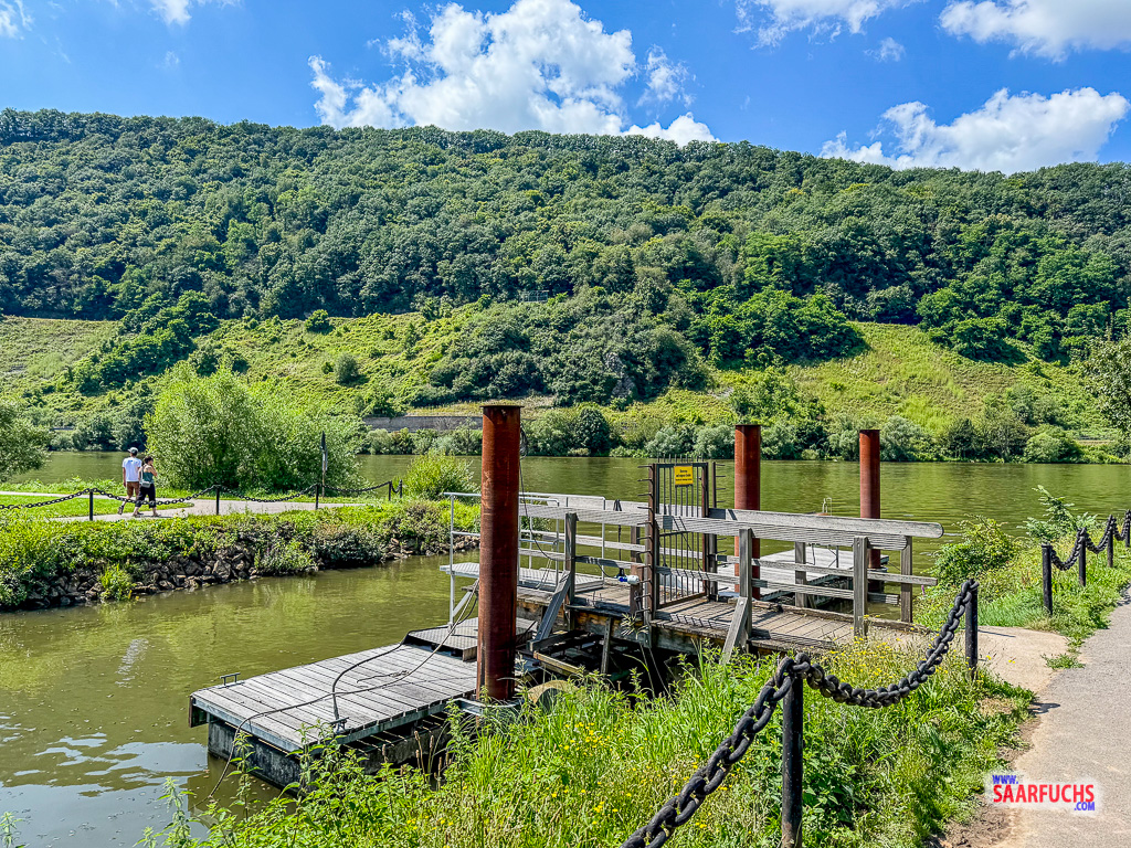 Anschließend lassen wir den Ort hinter uns und fahren auf dem Radweg zwischen den Weinbergen und der Mosel weiter. Dabei kommen wir auch an dieser schönen Sonnenuhr vorbei, nach der eine deutsche Weinlage benannt ist.