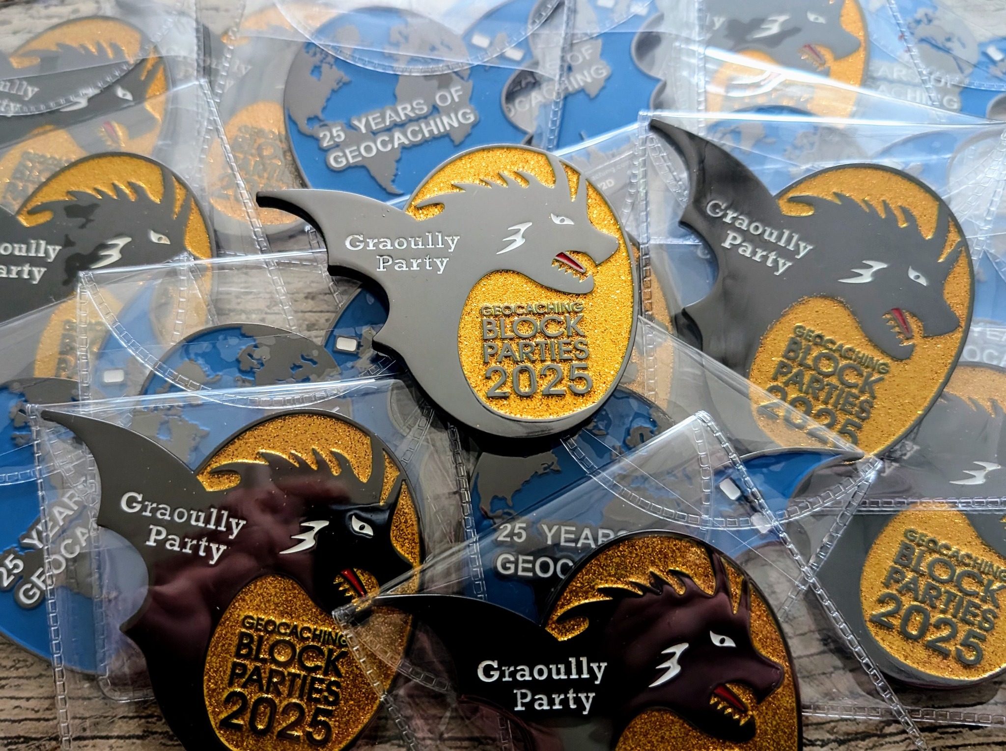 Wir nutzen Facebook, um unsere Block Party zu promoten und haben auch einen Online-Shop, den Sie hier finden: Graoully Party – 25 ans de Geocaching.