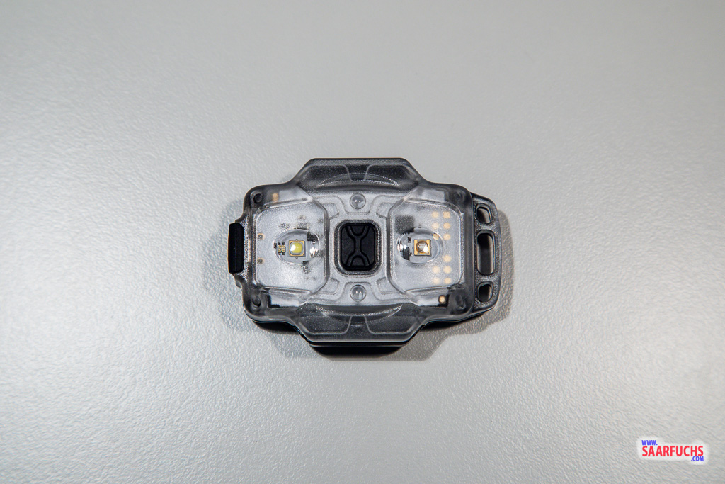 Die vier Stufen weißes Licht werden durch Klick-und-Halten von schwach bis stark und anschließend Blinken durchgeschaltet. Sobald der Schalter losgelassen wird, bleibt dieser Leuchtmodus aktiviert. Die Lampe hat einen sehr breiten Strahl, der das Umfeld erleuchtet, dafür aber nicht weit in die Ferne reicht.
