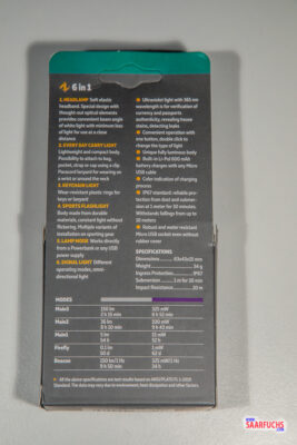 Auf der Rückseite ist viel Text zu finden: Hier werden die möglichen Einsatzgebiete dargestellt und die Leuchtdauer und -kraft der einzelnen Modi aufgelistet.
