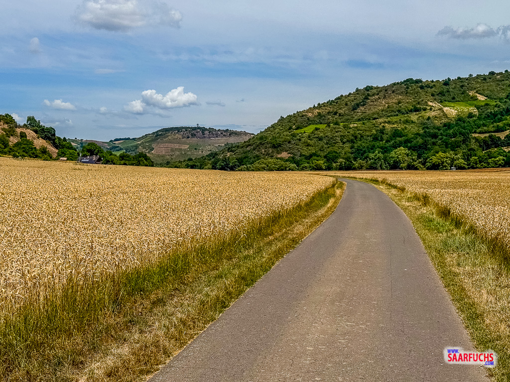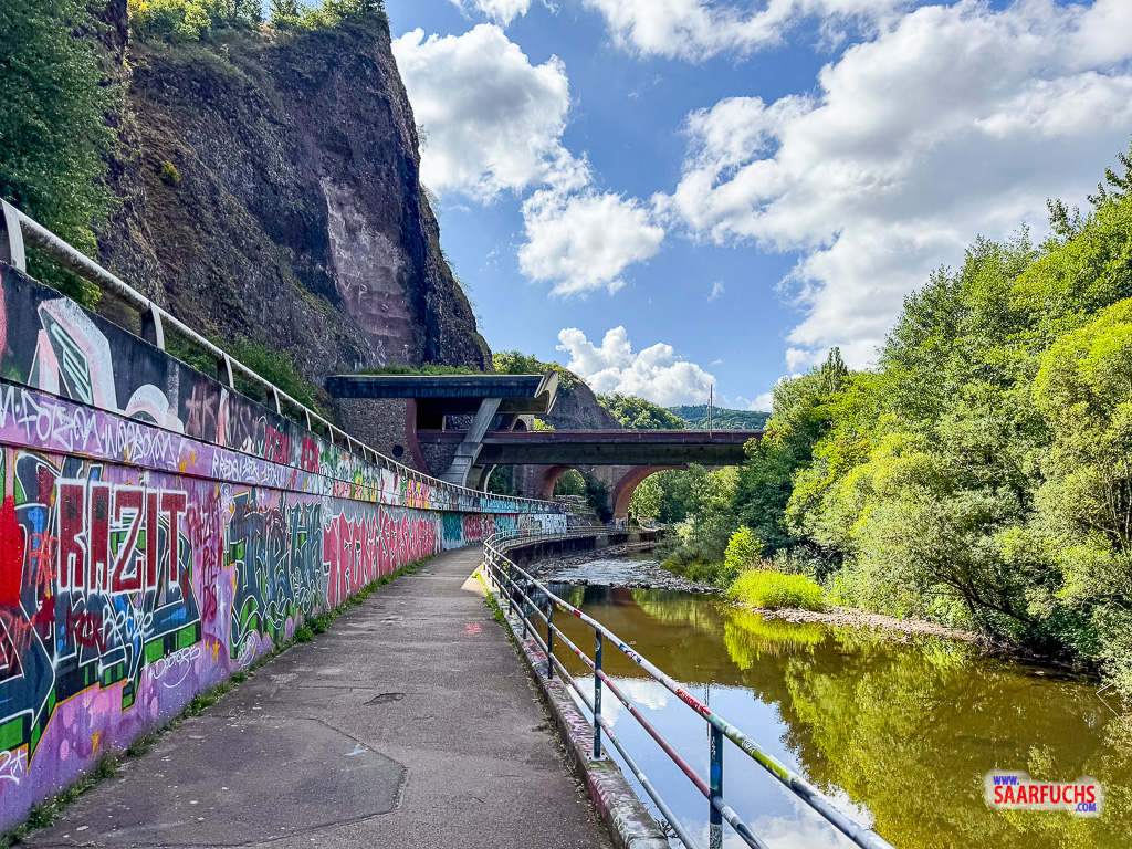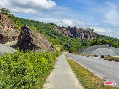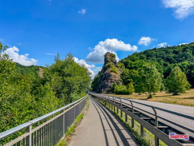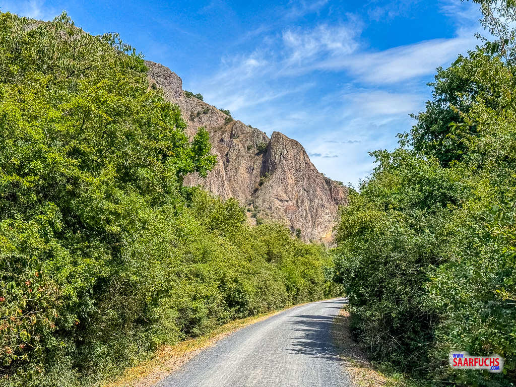 Zunächst fahre ich parallel zu einer Landstraße unterhalb einer Felsformation, auf der sich der Nahe-Skywalk befindet, hindurch.