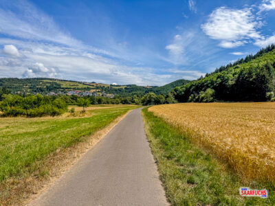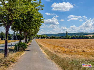 Anschließend fahre ich durch einen Park am Barfußpad entlang, auf dem bei dem tollen Wetter heute Einiges los ist. Danach radele ich über einen Landwirtschaftsweg immer parallel zur Nahe.