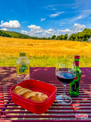 Es wird Zeit für die Mittagsrast. Am Ortseingang befindet sich ein Picknicktisch mit zwei Bänken. Dort lasse ich mich nieder und packe mein Picknick aus. Es gibt ein belegtes Baguette und einen kleinen Rotwein. Gerne hätte ich mir einen regionalen Wein gekauft – doch leider fehlt es an einem Weinautomaten in der Nähe des Picknickplatzes.