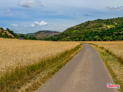 Danach wechsele ich die Naheseite und fahre durch den Wald und zwischen Feldern und Wiesen vorbei in Richtung Merxheim.