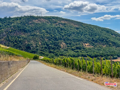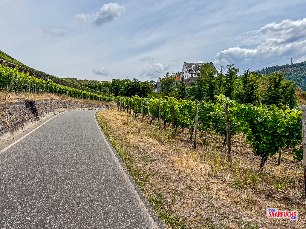 Kurz hinter der Burg Böckelheim fahre ich über die kleine Landstraße K58 zweimal über die Bahnlinie, bevor es dann unterhalb des Guts Hermannsberg durch die Weinberge nach oben geht. Das ist die einzige größere Steigung auf der ganzen Radtour. Mit meinem E-Bike ist das natürlich kein Problem.