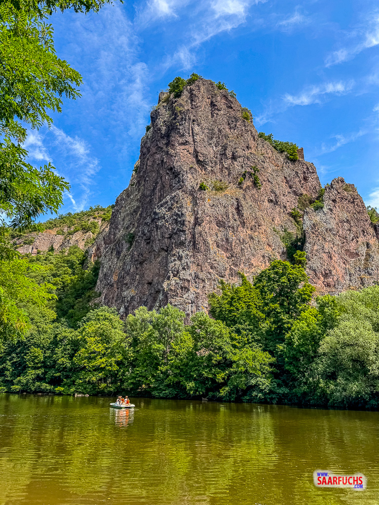 Am Schwimmbad biege ich rechts ab in den Kurpark und folge weiter den Markierungen des Nahe-Radwegs. Als sich rechts ein Lücke in den Bäumen öffnet, stelle ich mein Rad ab und gehe hinunter zum Fluss. Gleich gegenüber ragt der mächtige Rheingrafenstein in die Höhe.