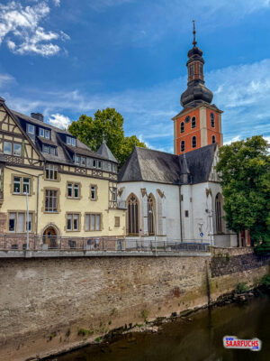 Ich folge den Schildern über die Autobrücke in die Fußgängerzone. Oberhalb vom Marktplatz ist schon die berühmte Felsenkirche zu sehen. Sie wurde der Sage nach im 15. Jahrhundert von einem Adligen als Buße für einen Brudermord an ihrem jetzigen Standort erbaut. Tatsächlich wurde sie jedoch zwischen 1482 und 1484 von Wirich IV. von Daun-Oberstein auf den Fundamenten einer älteren Höhlenburg errichtet. Bis heute ist sie ein beeindruckendes Wahrzeichen der Stadt.