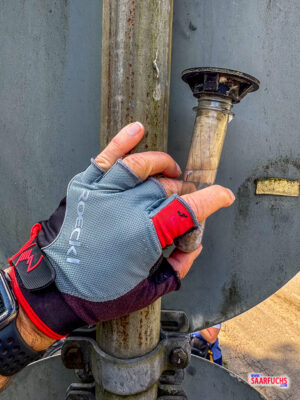 Kurz vor einer großen Brücke piepst mein GPS. Nach einer kleinen Kletteraktion, die in den Radschuhen gar nicht so einfach ist, halte ich den Geocache Eisenbein #2 (reconstructed) in der Hand.
