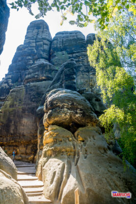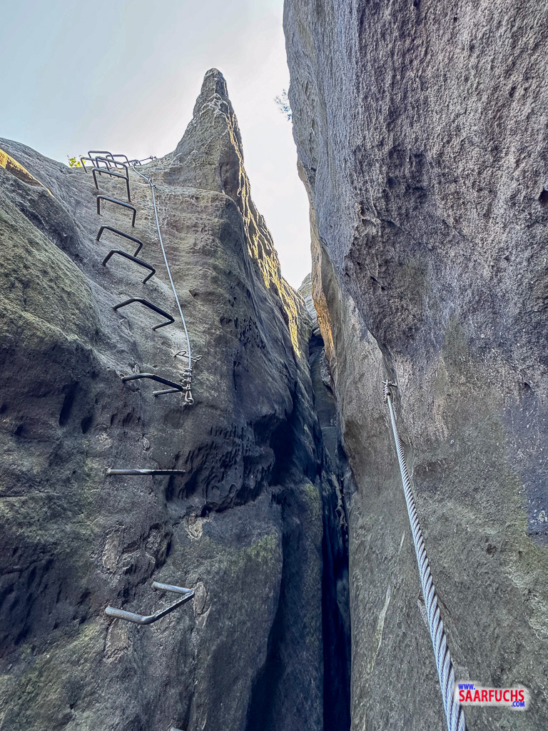 Mein persönliches Highlight war die Häntzschelstiege, einer der wenigen echten Klettersteige in der Sächsischen Schweiz. Die technischen Schwierigkeiten sind überschaubar, allerdings müsst ihr hier zwingend schwindelfrei sein, da es an einigen Stellen senkrecht die Wand hinaufgeht, mit viel Luft unter dem Hintern. Die Verwendung eines Klettersteigsets ist vorgeschrieben. Diese Stiege darf nur aufwärts begangen werden.
