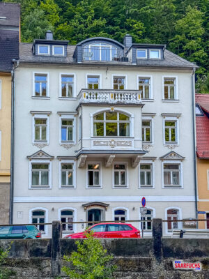 Da ich mit Freunden diesen Wanderurlaub plane, suchen wir uns eine Ferienwohnung in zentraler Lage im Herzen von Bad Schandau. Unsere Wahl fällt auf das Apartmenthaus Albrechtsburg (Provisionslink), welches einen privaten Parkplatz anbietet. Das Haus liegt unmittelbar gegenüber vom Kurpark. Bis in die Altstadt sind es nur wenige Minuten zu Fuß.