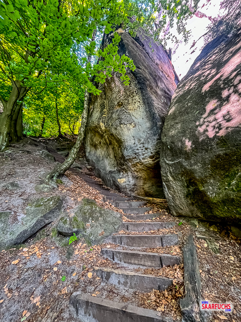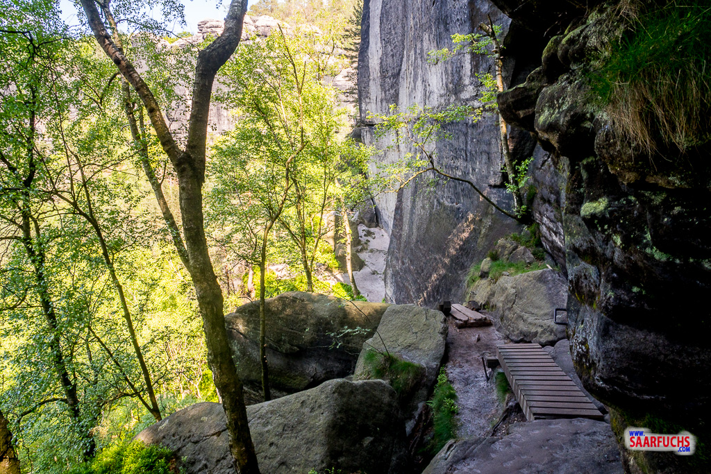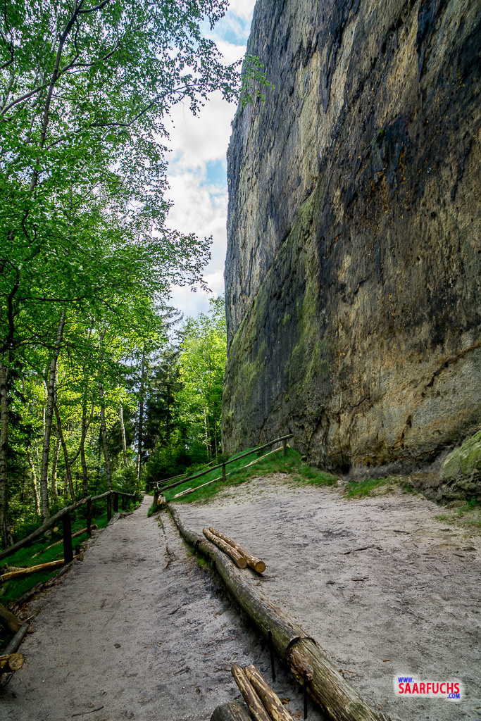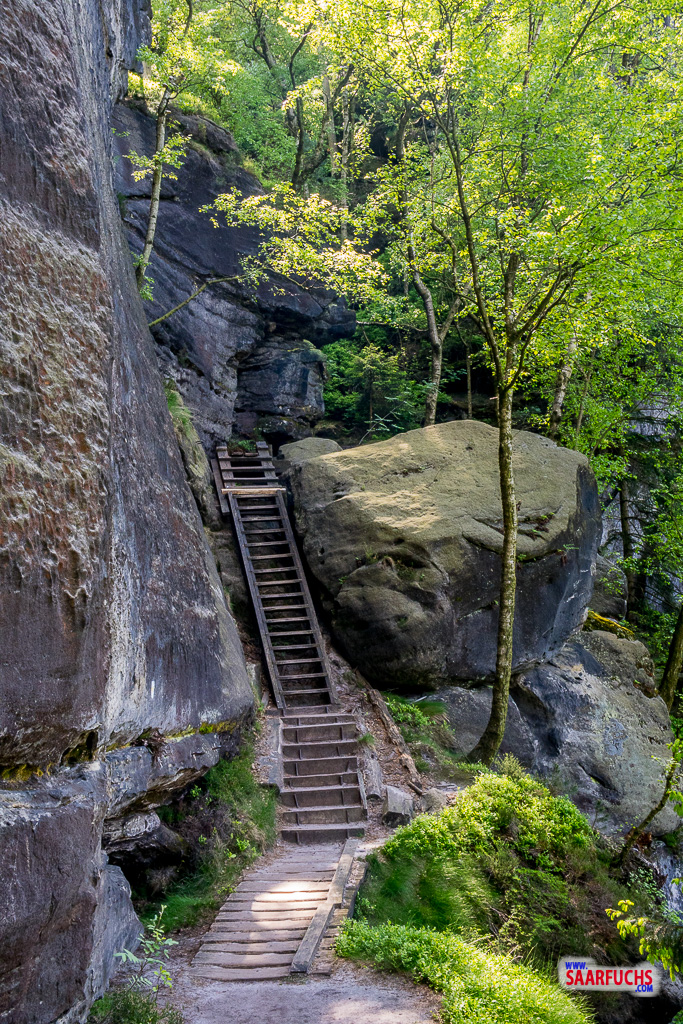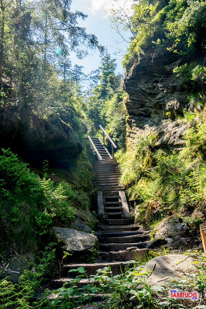 Wir biegen nach rechts ab und folgen den Treppen und kleinen Serpentinen nach unten. Unser Wanderpfad führt uns ganz dicht an der hohen Felswand der Domkanzel vorbei. Neben Treppenstufen gibt es hier auch Leitern und Stege. Ich finde es sehr beeindruckend, wie hier ein spannender Weg geschaffen wurde!