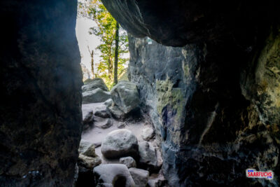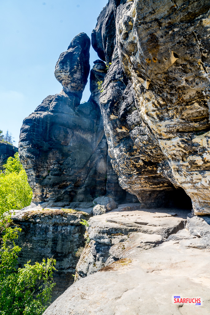 Gemeinsam wollen wir uns jetzt die Idagrotte anschauen. Sie ist eine beeindruckende Kluft- und Schichtfugenhöhle am Felsfuß des Friensteins und ist nur über ein schmales und ausgesetztes Felsband erreichbar. Die Idagrotte ist ein beliebtes Wanderziel in den Affensteinen und bietet einen spektakulären Blick auf die umliegende Felslandschaft. Klingt doch spannend, oder?