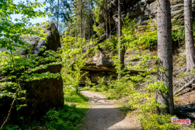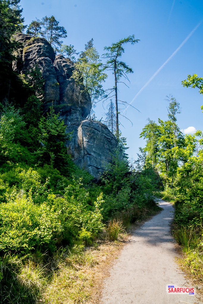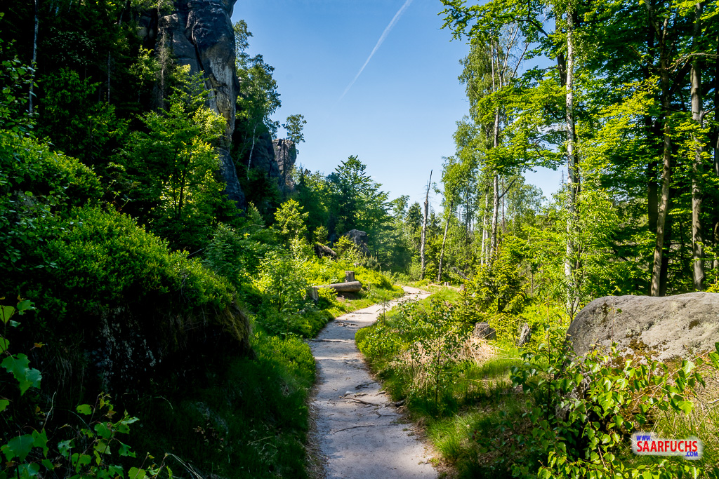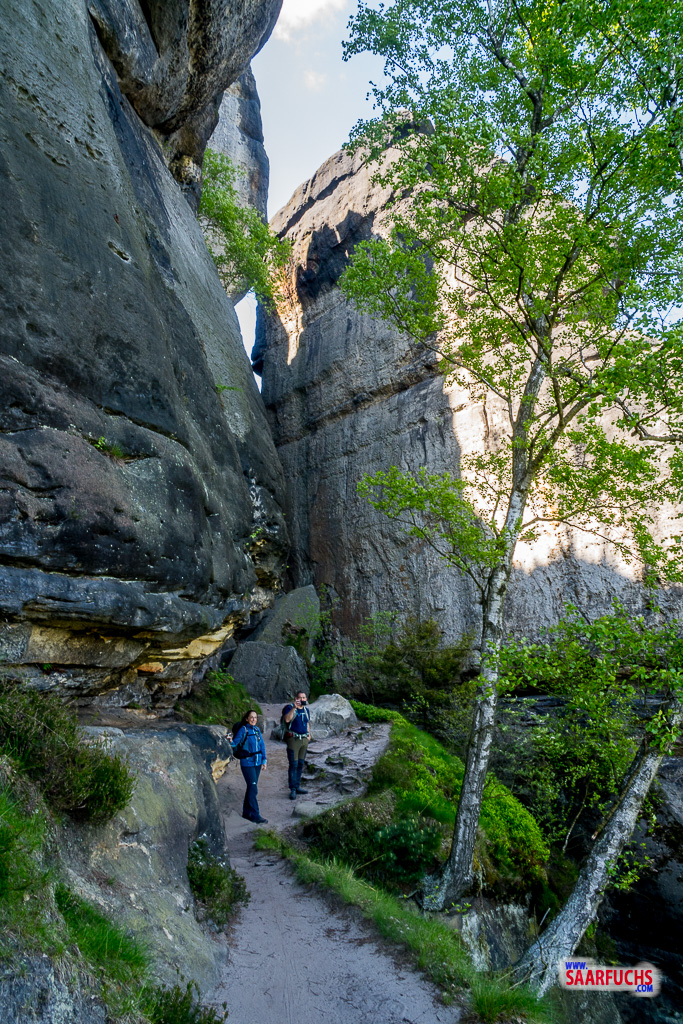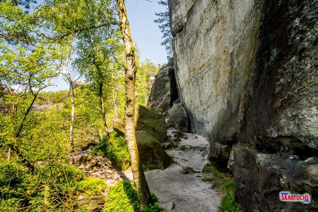Die Obere Affensteinpromenade ist ein beliebter und aussichtsreicher Bergpfad in den Affensteinen. Er zieht sich auf halber Höhe um die markanten Felswände. Diesem Bergpfad folgen wir jetzt bis zur kleinen Domstiege.