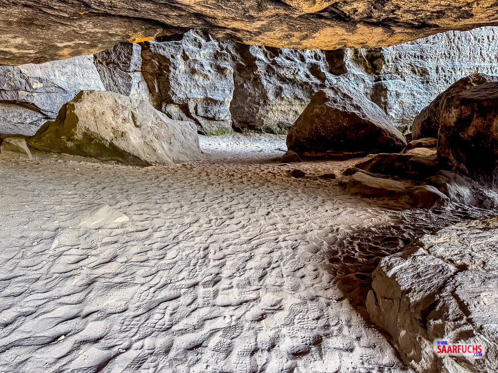 Die Grotte ist riesig, wenn auch stellenweise nicht sehr hoch. An der Informationstafel lese ich die Fakten ab, die ich zur Beantwortung des Earthcaches Die Friensteinhöhle (Idagrotte) benötige. Auch den Labcache Sächsische Schweiz / Saxon Switzerland Hiking : S3 Stage 3: Frienstein kann ich dort schnell und einfach lösen.