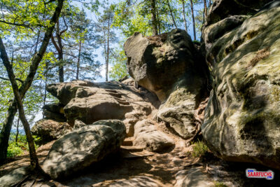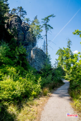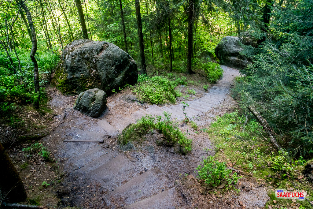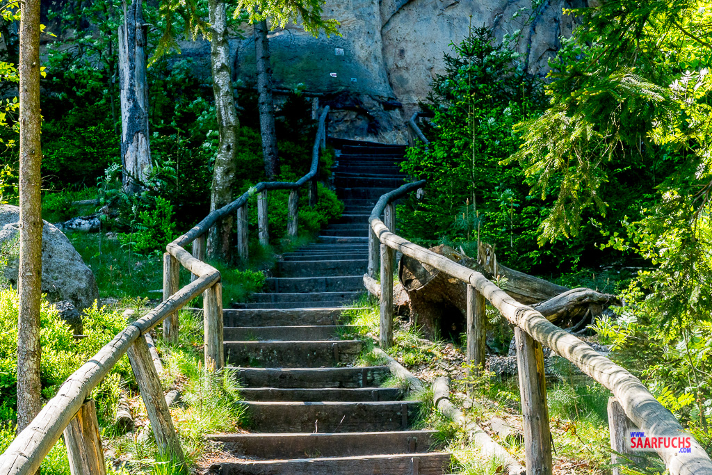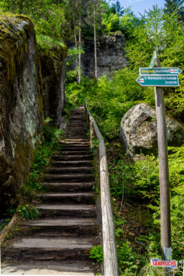 An einem Felsen verlassen wir den Pfad nach links. Geradeaus geht es hinunter in die Wilde Hölle. Wir folgen den in den Fels gehauenen Stufen hinauf zum Carolafelsen.