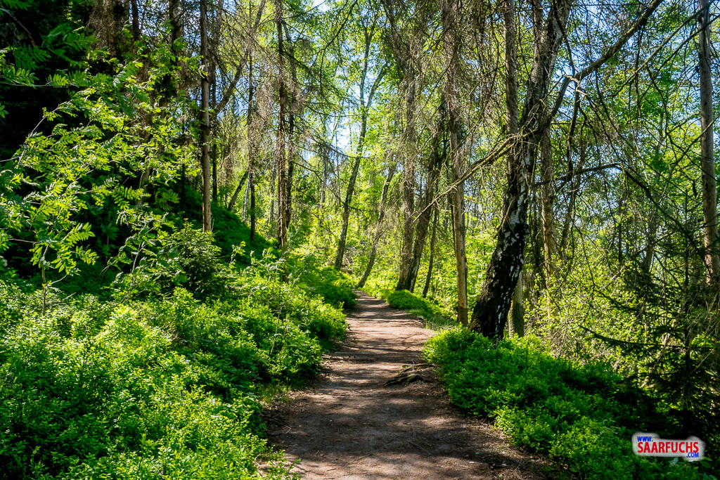 Danach folgen wir weiter dem gut ausgeschilderten Wanderpfad in einem großen Bogen um eine Schlucht durch den Wald.