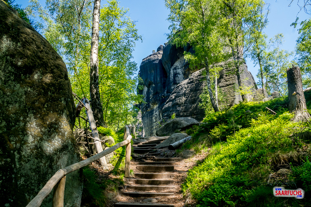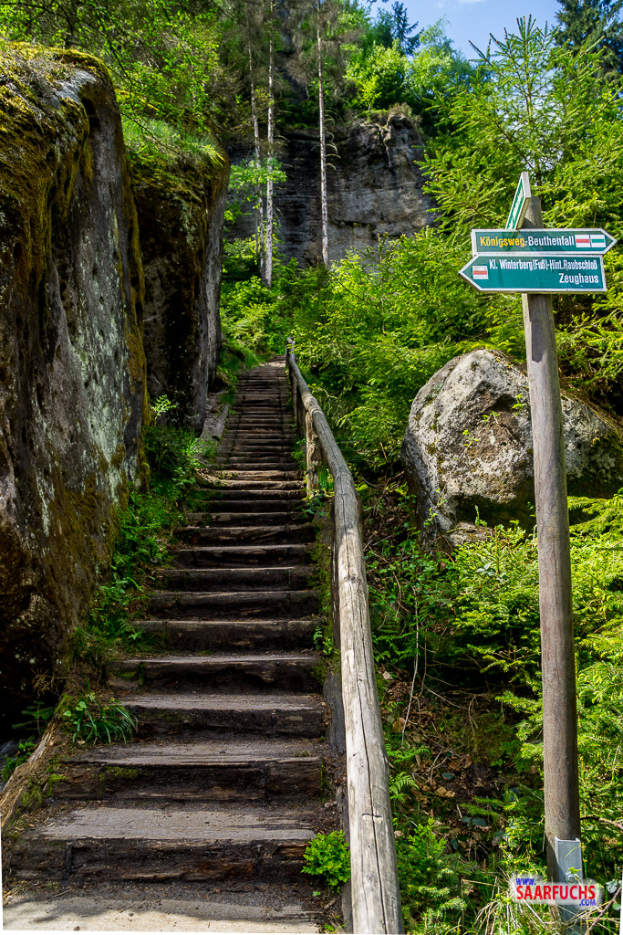 An der nächsten größeren Abzweigung halten wir uns rechts und folgen den Wegweisern zum Carolafelsen. Zunächst ist es ein breiter Waldweg. Hier kommt auch der Wanderweg von der Hänzschelstiege herauf. Eine Barriere weist dort darauf hin, dass diese Stiege nur von unten nach oben begangen werden darf. Wir halten uns links und folgen den Treppenstufen bergab.