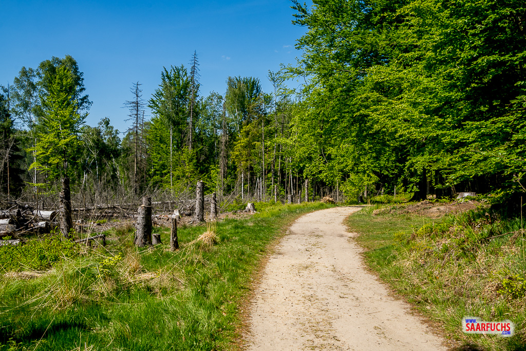 Nach etwa 700 Metern treffen wir auf den breiten Fahrweg, der uns anschließend ganz bequem zum Wanderparkplatz Nasser Grund leitet.