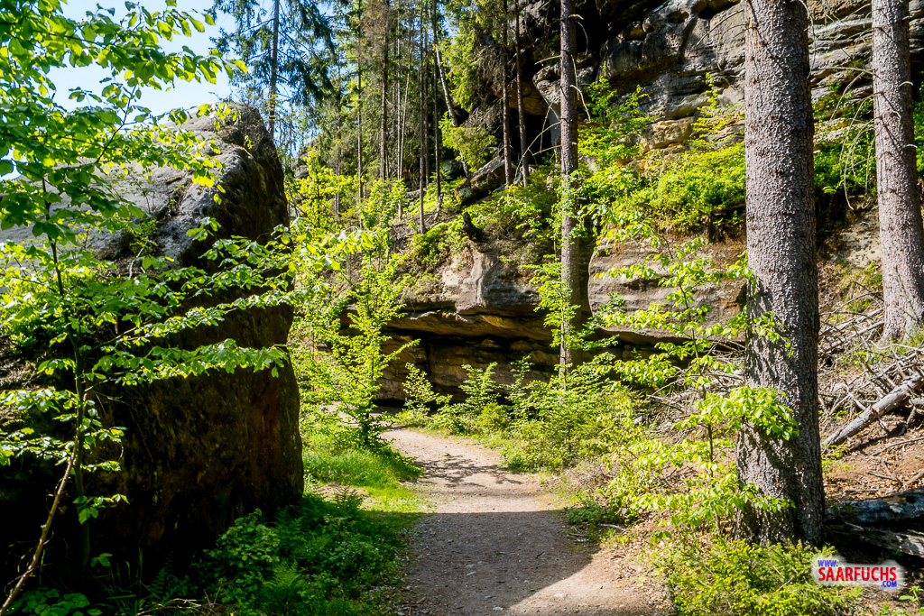 Nach einer scharfen Linkskurve laufen wir auf das kleine Prebischtor zu. Es ist ein Felsentor in Miniaturform. Hier können der Labcache Felsentore im Elbsandsteingebirge : S2 Kleines Prebischtor und der Earthcache Das Tor unter der Buche geloggt werden.