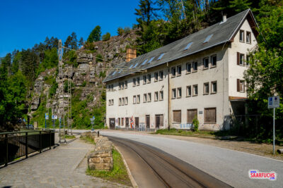 Nach knapp einer halben Stunde Fahrt erreicht unsere Straßenbahn die Haltestelle Beuthenfall, wo wir aussteigen. Das verlassene Gebäude war einst ein Gasthaus, das im Zuge des florierenden Tourismus rund um den Wasserfall betrieben wurde. Heute ist die Ruine sehr baufällig. Deshalb wurden bereits Sicherungsmaßnahmen durchgeführt und der Abriss ist perspektivisch geplant.