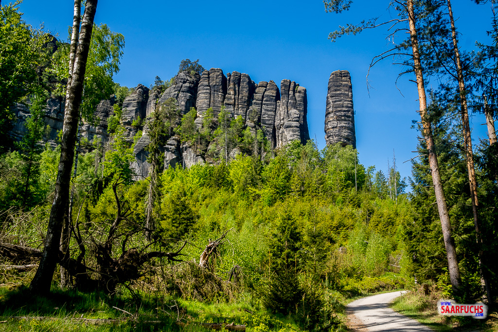 Hinter der Brücke wandere ich mit unserer Gruppe gemütlich den breiten Fahrweg durch den Dietrichsgrund hinauf. Schon von Weitem sind die imposanten Felsnadeln des Bloßstock gut zu sehen. Der Bloßstock ist ein markanter, etwa 80 Meter hoher Felsenturm in den Affensteinen. Er zählt zu den bekanntesten und beliebtesten Klettergipfeln der Sächsischen Schweiz. Er wurde 1899 erstmals bestiegen.