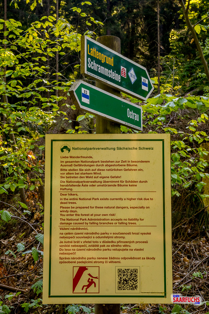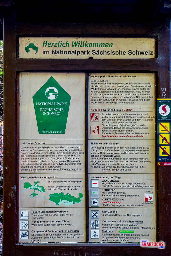 Dort biegen wir links an in den ausgeschilderten Wanderweg zu den Schrammsteinen. Eine große Informationstafel weist auf die Regeln im Nationalpark hin.