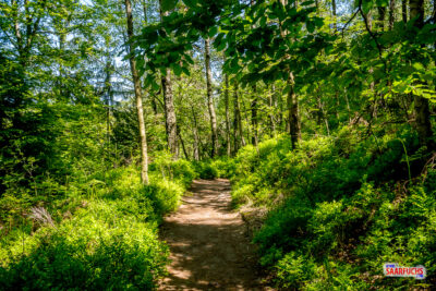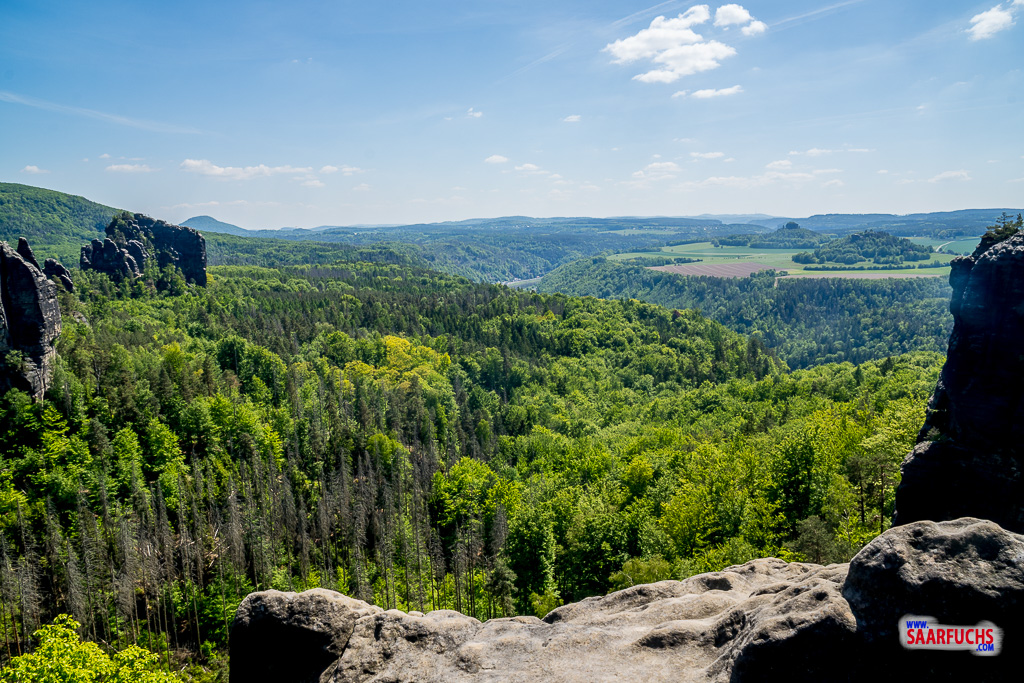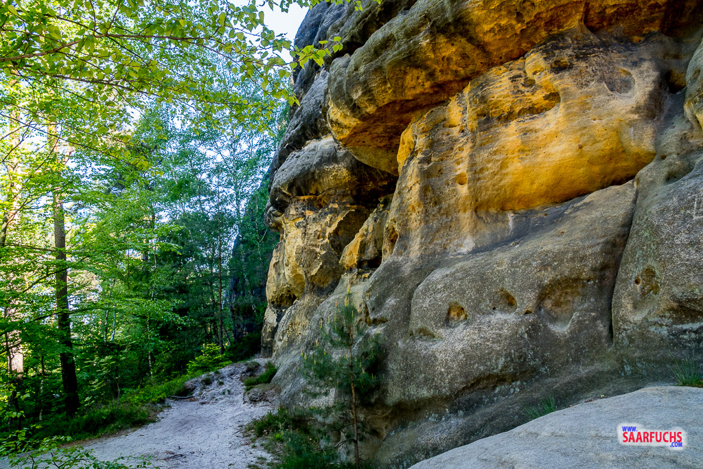 Wir folgen weiter dem Gratweg, über den hier oben auch der bekannte Malerweg verläuft. Wir wandern über kleine Pfade durch einen schönen Wald. Unterwegs kommen wir an vielen Felsen vorbei.