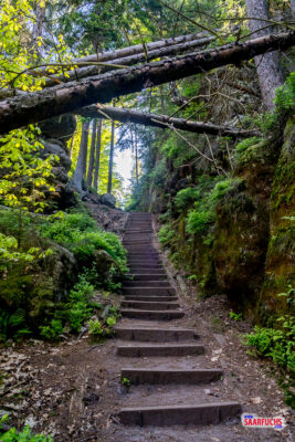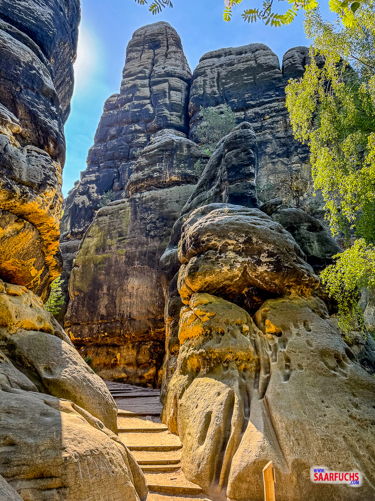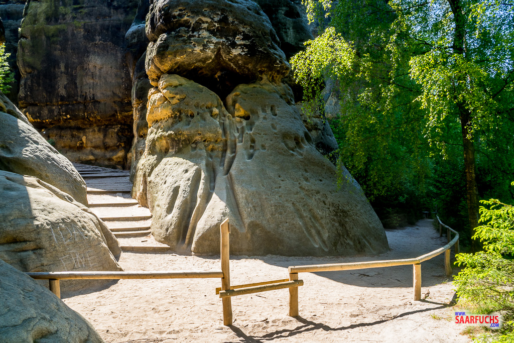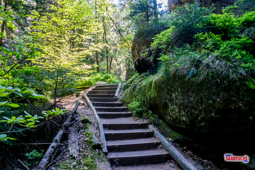 Nachdem wir um die Jungfer, einen markanten Felsturm gelaufen sind, erreichen wir eine Kreuzung, an der gleich zwei Stiegen abzweigen.